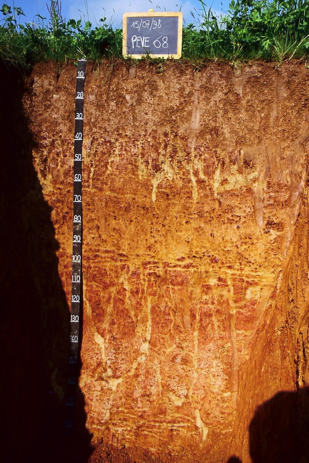Orizzonte Bt1 : 95 - 120 cm; umido; colore bruno intenso (7,5YR 5/6); colore delle facce rosso (2,5YR 4/6); screziature 15 %, con dimensioni medie di 8 mm, con limite netto, dominanti di colore grigio rossastro chiaro (2,5YR 7/1); tessitura franca; scheletro 0 % , di forma n.i.; struttura lamellare grossolana di grado forte; resistenza: estremamente resistente; cementazione molto forte; molto adesivo; molto plastico; non calcareo; pellicole primarie di argilla 15 %, presenti n.i., pellicole secondarie ferromanganesifere 10 %, presenti n.i.; limite inferiore chiaro.