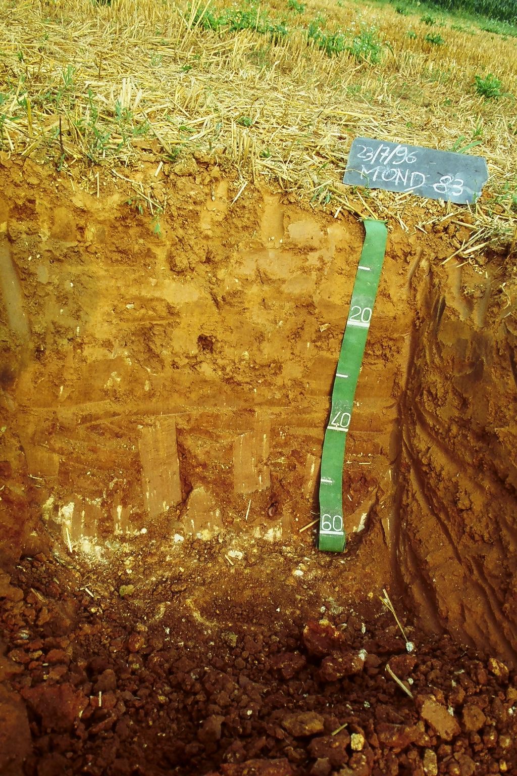 Orizzonte Bt : 30 - 50 cm; colore rosso giallastro (5YR 4/6); tessitura franco sabbioso argillosa; scheletro 5 % , di forma subarrotondata con diametro medio di 30 mm e diametro massimo di 50 mm, alterato; struttura poliedrica angolare fine di grado forte; radici 0/dmq, con dimensioni medie di mm , orientamento n.i.; moderatamente plastico; non calcareo; pellicole primarie di argilla 10 %, presenti n.i.