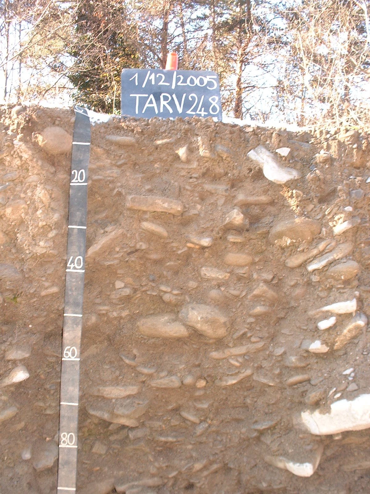 Orizzonte C : 70 - 100 cm; umido; colore bruno olivastro chiaro (2,5Y 5/3); colore subordinato olivastro (5Y 5/3); tipo colore litocromico; tessitura sabbiosa; scheletro 60 % , di forma irregolare con diametro medio di 100 mm e diametro massimo di 400 mm, non alterato; radicabilità 10 % ; resistenza: incoerente; cementazione molto debole; non adesivo; non plastico; molto fortemente calcareo; limite inferiore non raggiuto.