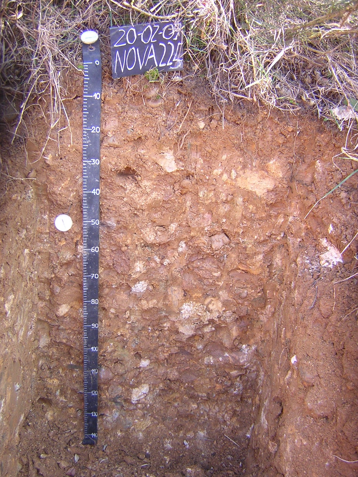 Orizzonte Bt : 20 - 50 cm; umido; colore bruno (7,5YR 5/4); colore subordinato bruno intenso (7,5YR 5/6); tipo colore ossidato; tessitura franco sabbioso argillosa; scheletro 25 % , di forma subarrotondata con diametro medio di 50 mm e diametro massimo di 70 mm, fortemente alterato; struttura poliedrica angolare media di grado debole; macropori < 0,1 % con dimensioni medie 1-5 mm; radicabilità 50 % ; resistenza: debole; cementazione molto debole; debolmente adesivo; non plastico; non calcareo; pellicole primarie di argilla 10 %, presenti sulle facce degli aggregati; limite inferiore graduale.
